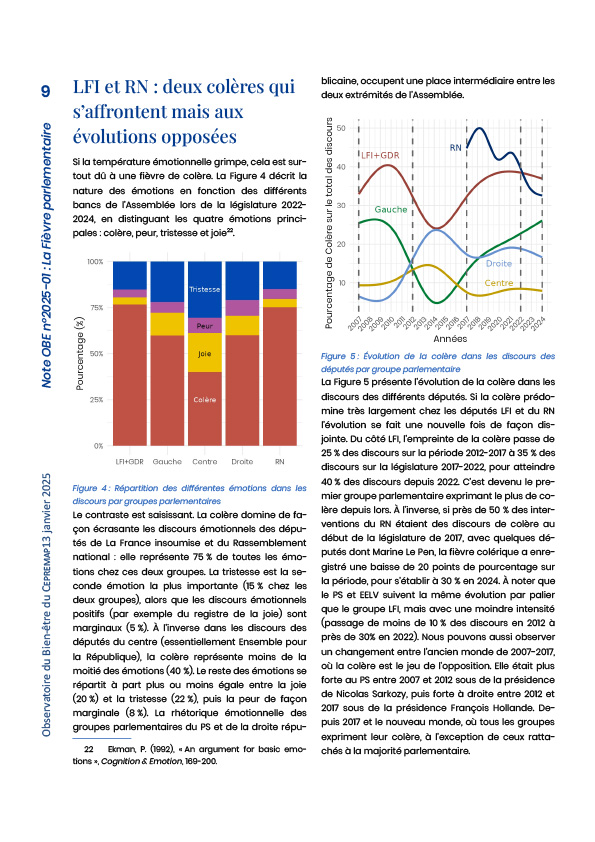 deux millions de discours prononcés entre 2007 et 2024. La rhétorique émotionnelle, en particulier celle de la colère, s’est imposée depuis 2017, et de façon encore plus marquée à partir de 2022, tandis que le débat rationnel recule. Les interventions s’appauvrissent et se raccourcissent grandement ; les débats argumentés entre adversaires se sont transformés en attaques et interruptions systématiques entre ennemis. Cette fièvre est surtout portée par La France Insoumise et le Rassemblement National, bien que leurs trajectoires divergent, le RN adoptant progressivement une stratégie de normalisation.
